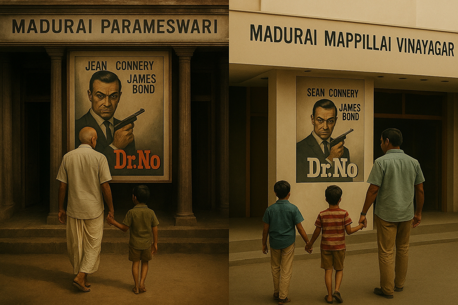 When Dr. No was released at Madurai Parameswai theatre (located at Karimedu) in the middle or the late 1960s, our grandfather Bhava Thevar took my father. Reportedly, Parameswai theatre released all of the Bond films till 1980s and some hindi films apart from regional releases. That's is how my father was introduced to Sean Connery as Ian Fleming's James Bond. In the late 1980s, our father rented the video cassatte (VHS) of Dr No, and we sibling brothers and sisters watched at home. Then, the journey of James Bond began with the first release of the new James Bond films and the second release of the old Bond films in Madurai Mappillai Vinayagar and Manicka Vinayagar theatres. That's how we were introduced to James Bond.